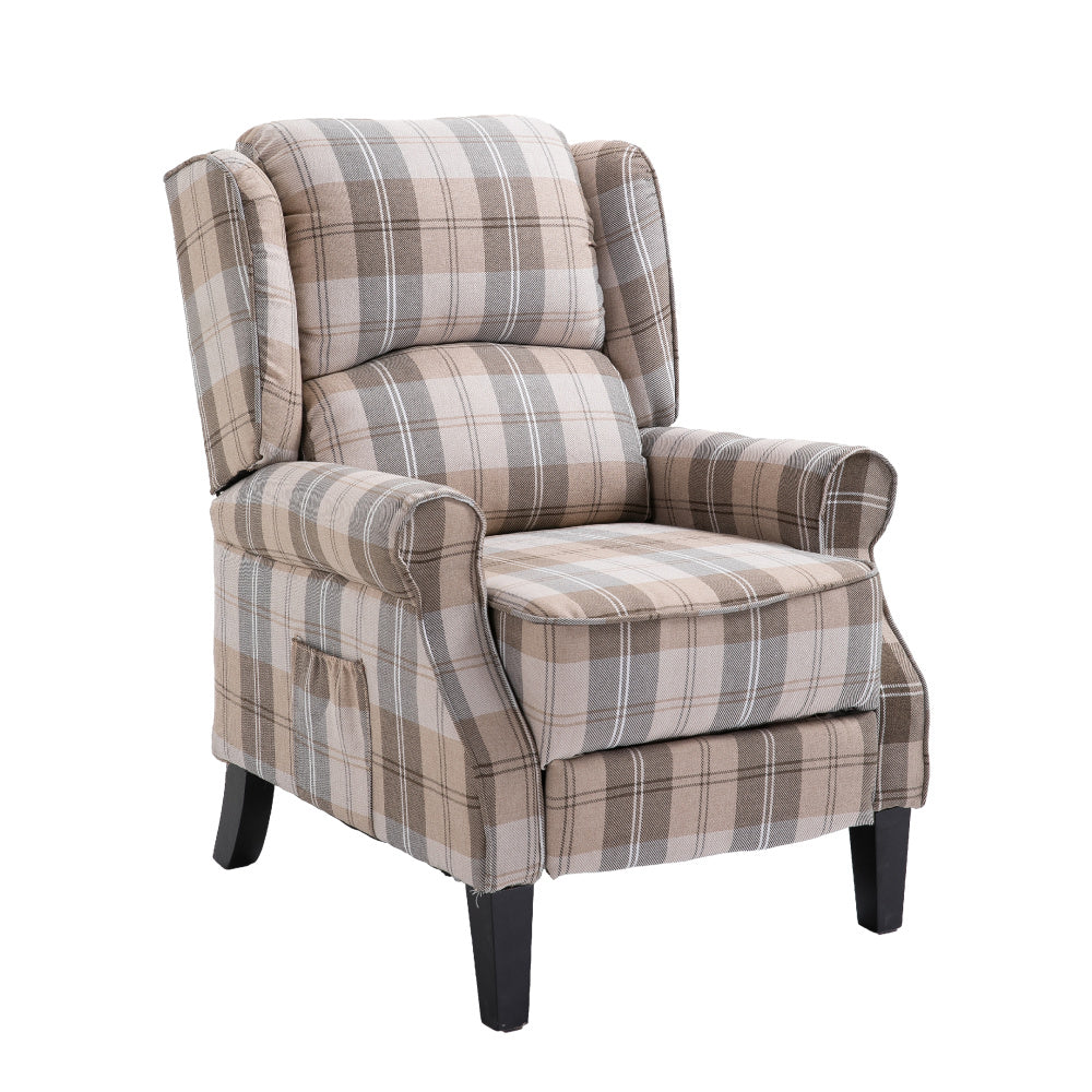 Every home deserves a cozy recliner, perfect for relaxing in the living room, reading nook, balcony, or even unwinding while watching a football game. This modern upholstered leisure chair features a stylish mid-century design with a tufted backrest and a reclining adjustment of up to 150 degrees, allowing you to lean back effortlessly for ultimate comfort. Crafted with a sturdy wooden frame, rubberwood legs, and soft fabric upholstery in a charming blue check pattern, it adds both elegance and functionality to any space. Measuring 27.5" (L) x 33" (D) x 40.5" (H) with a seat height of 20.4" and a width of 18.5", this chair is also an excellent choice for office breaks, offering a stylish and comfortable place to rest.